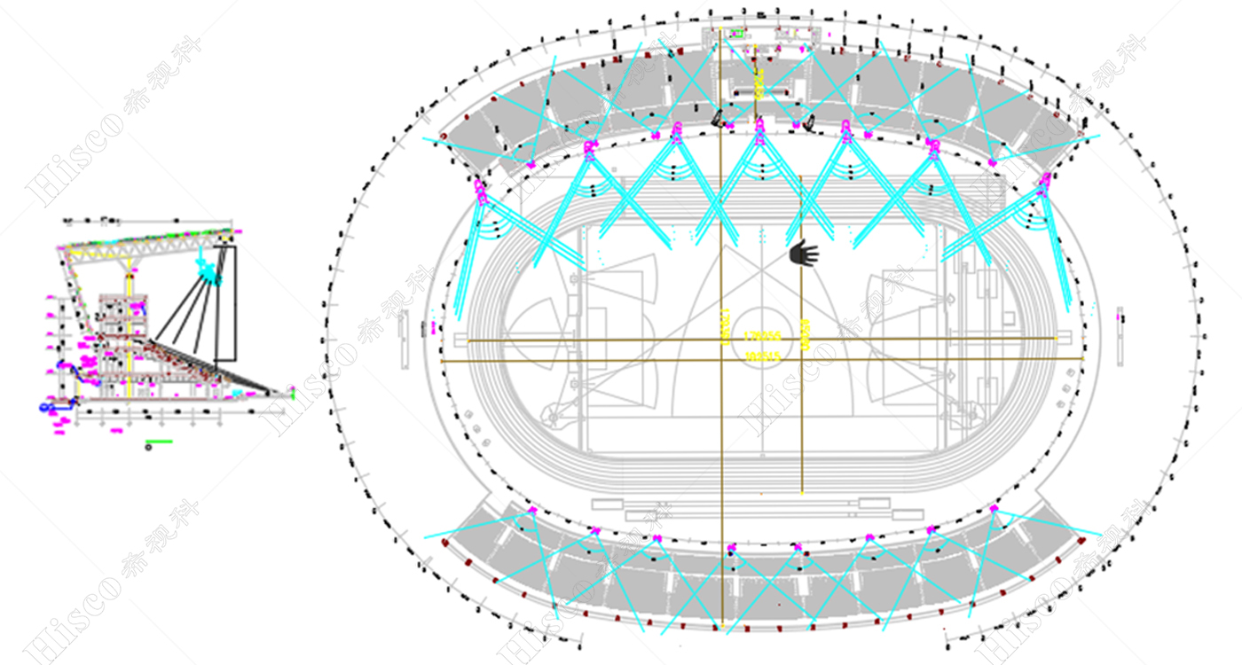 观众席有四层,二层为包厢。东边看台到西看台距离约240米,南北约250米,雨棚约55米,顶约50米,看台最高点到顶部约30米。整个系统采用网络方式组建,同时我们还要保证其中任何一台设备出现故障时,不能造成场内听不到声音的情况。音源—调音台--处理器—功放—扬声器,我们需要对整个系统进行备份。