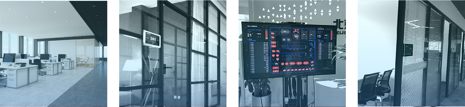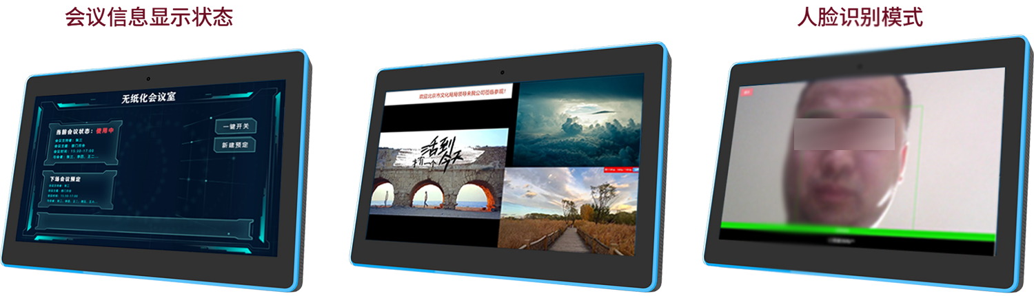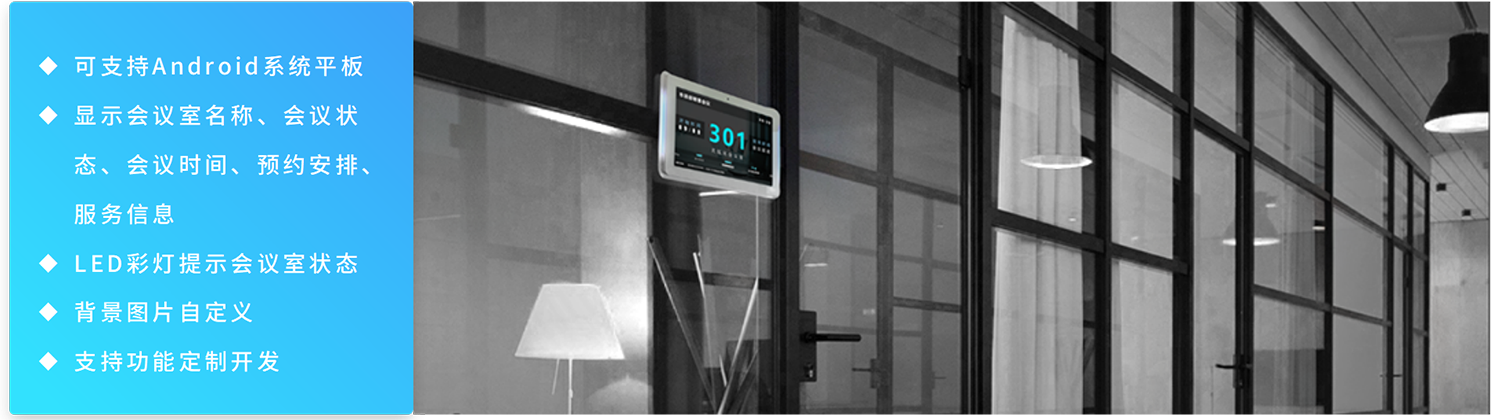 安装在会议室门口,可以挂墙也可以嵌入墙体安装。用来显示会议室名称、会议室使用状态、服务状态(会议中、下场会议时间)、当前日期时间、当天会议预约安排。