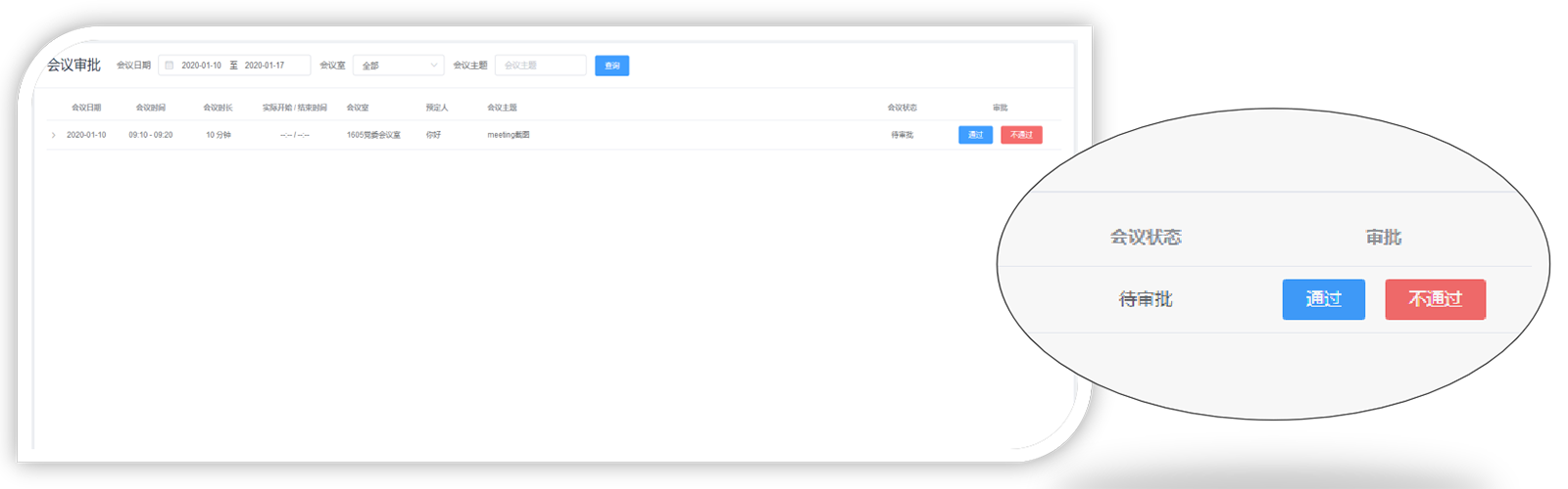 会议审批:管理员权限对管理会议室的预约申请进行审批