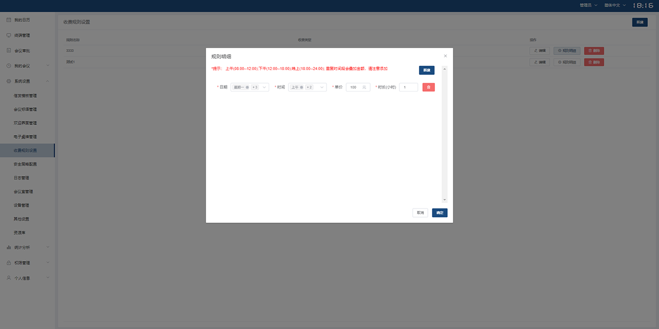 可选择收费时间段,填写单价和时长,便于管理人员一键操作。
