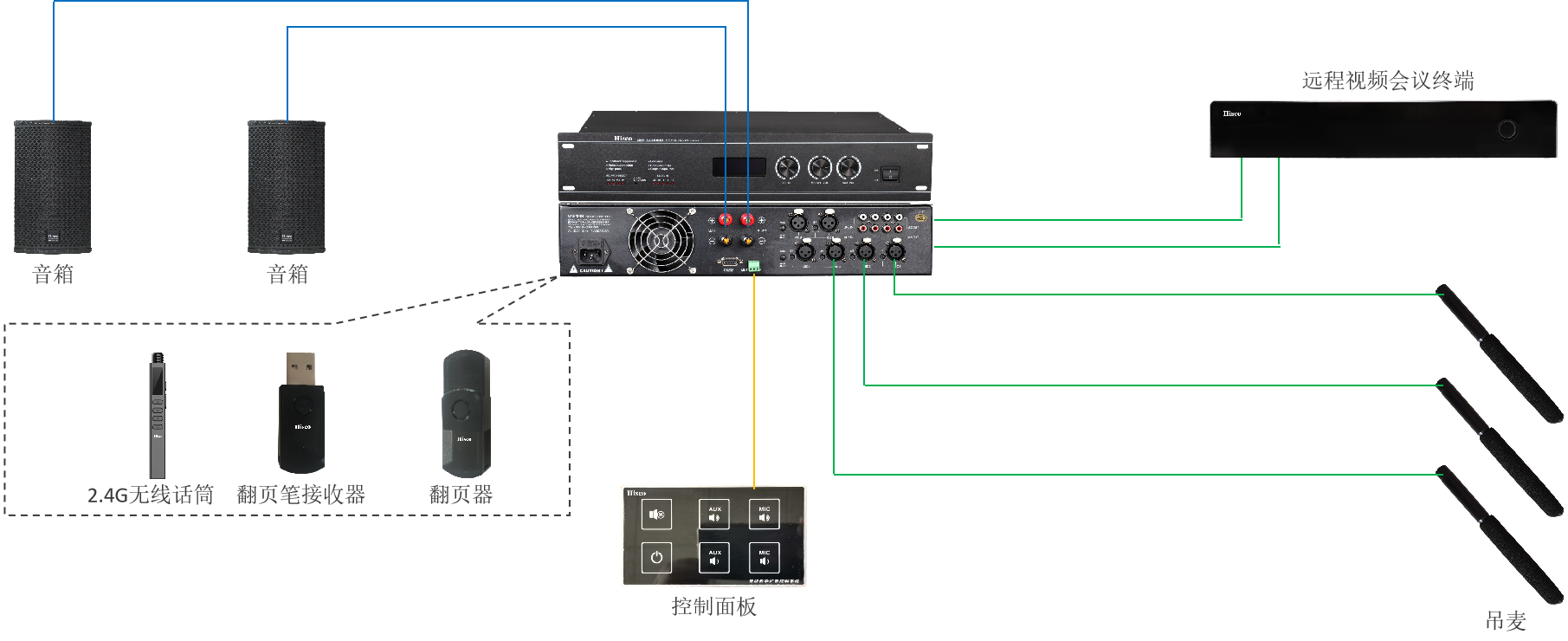 9、无线话筒高度集成     10、话筒自动选择      11、一键静音           12、自动静音         13、键盘上锁          14、中控控制      15、远程互动       16、自带2*100W功放