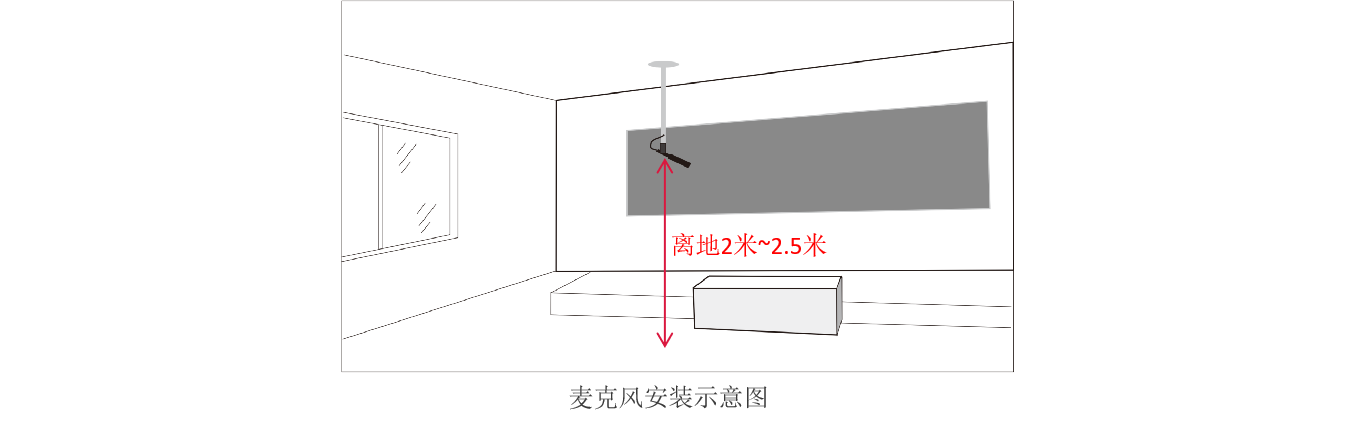 一、麦克风安装位置应在讲台与第一排学生桌子之间的上方,高度离地面在2-2.5之间以确保得到最大的拾音范围,并用吊咪专用吊架固定好,适当调整麦克风的水平角度以得到最佳的拾音效果。