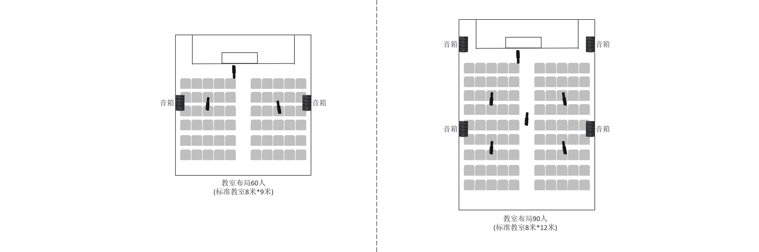 三、教室宽12,讲台长8,可安装2支吊咪,相隔2.5米左右,平均分布讲台长边。
