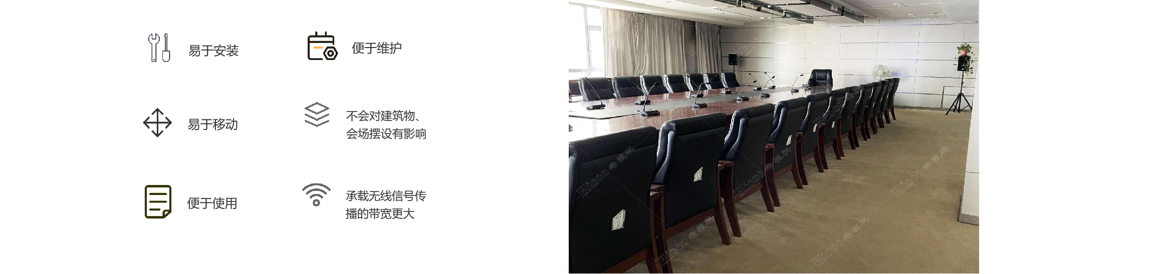 对于旧会议室改造、多功能厅、现场发布厅、临时会场等需要不破坏现场布置,能够快速方便搭建和移开会议系统的应用;传统有线手拉手会议很难甚至无法满足会场应用的要求。